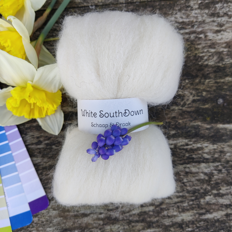 Voor deze tweede jaarfeest spinbox, Ostara, heb ik gekozen voor White Southdown . Een een krachtig lont met een fluffy volume. De vezel is niet de meest zachte met 28-30 micron, maar de vezellengte van 80mm geeft wel een heerlijk spinbaar lont.